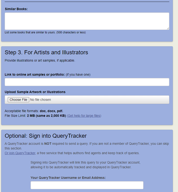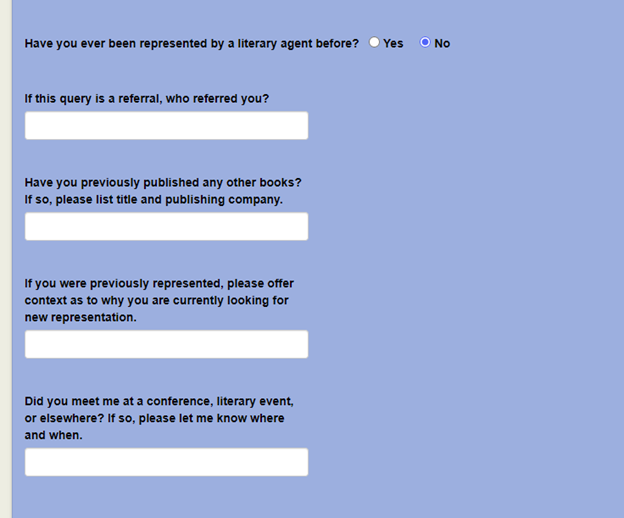 Query Manager: This is the most common way to query an agent. Query manager tracks and manages all your submissions (if you make an account) and is a customized form that agent receives from you.